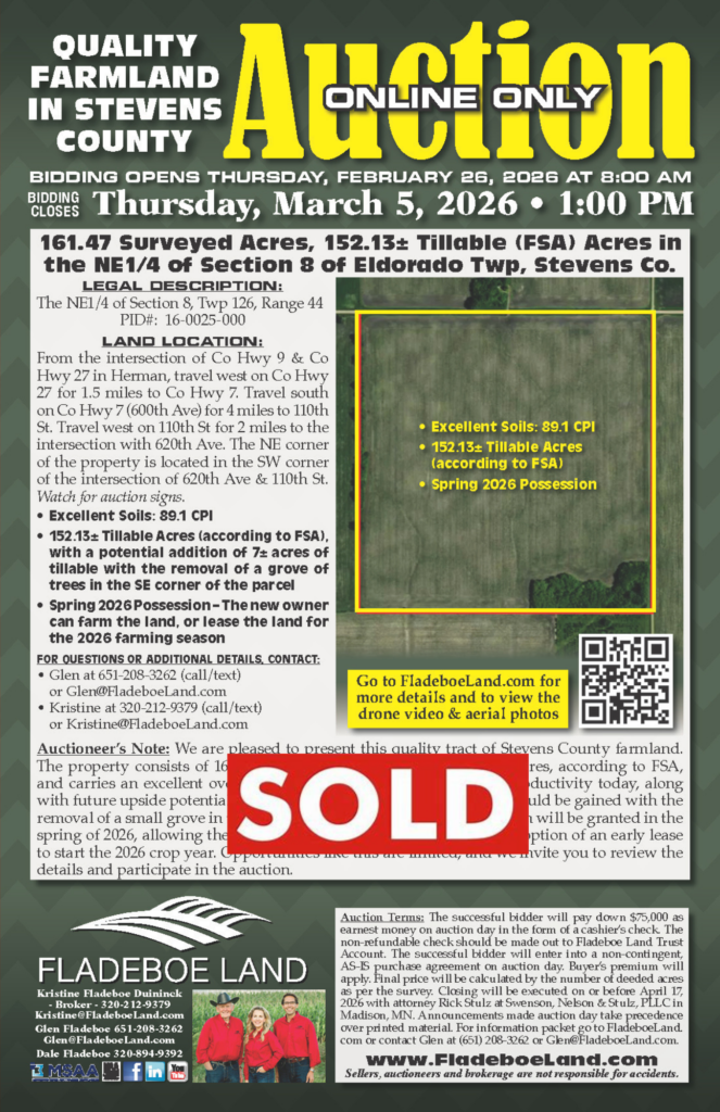 Thank you for your interest in Fladeboe Land and our upcoming auctions and listings. We count it an honor and a distinct privilege to be entrusted by our clients to market and sell their property. We offer auctions, listings, private sale negotiations, appraisals and consulting. We commit ourselves to doing our best to give prospective buyers as much information as possible, to ensure that the bidding, due diligence and buying experiences will be effortless and stress free. As you look over our auctions and listings please reach out to us if you have any questions or for a market analysis or complimentary consultation. Thank you for allowing us the opportunity to earn your business. We love what we do and we are excited to serve you.